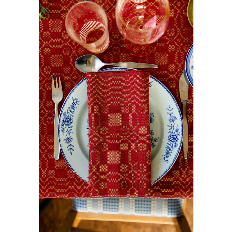 Beautifully patterned linen tablecloth with a wide decorative border.Tällbergskrus is one of the oldest patterns we make at Insjöns Väveri. It is believed to be listed in handloom weaving books from as far back as the mid-17th century. The pattern has gone by several different names depending on the area of production. The name Tällbergskrus was taken from the village of Tällberg in the northern part of Leksand. This classic design is made of cotton and linen with twisted, cotton warp in red or blue.This tablecloth is woven in 130 and 150 cm width and is available in several lengths. Our tablecloths shrink about 5% in width and 7% in length after washing. Please therefore take a shrinkage allowance into account.