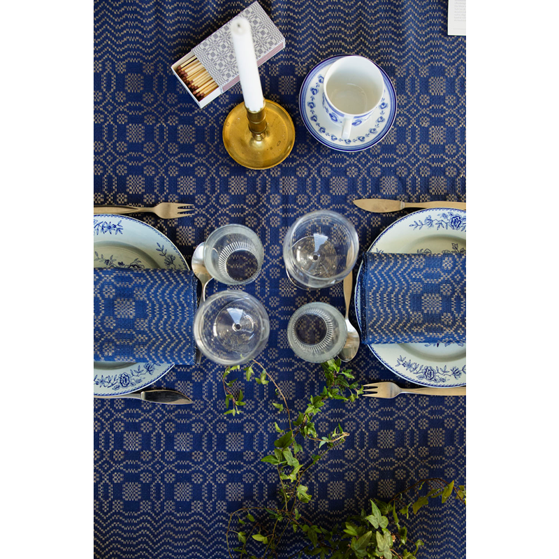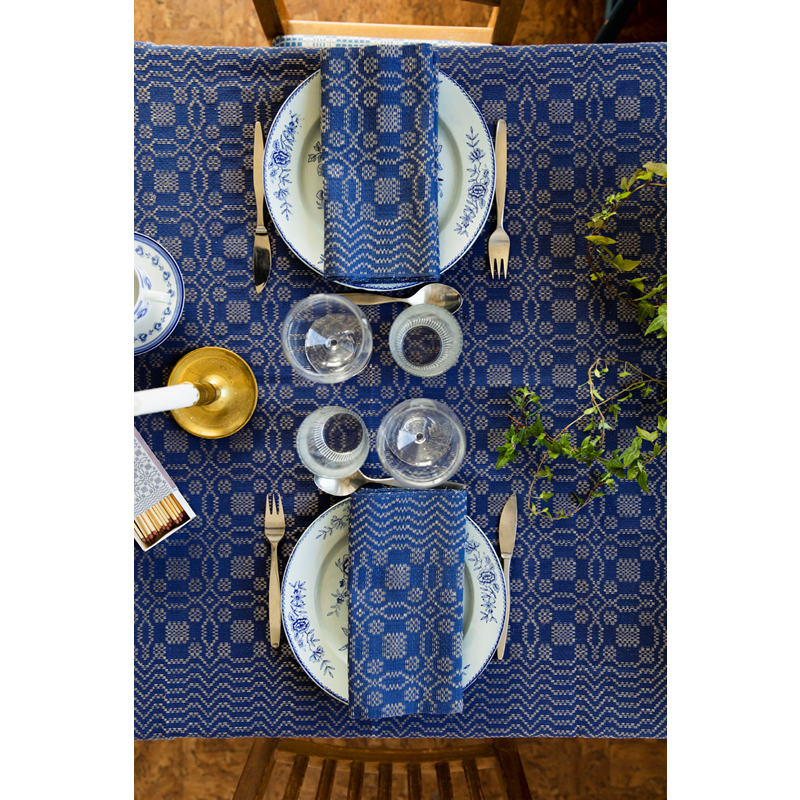Beautifully patterned linen tablecloth with a wide decorative border.Tällbergskrus is one of the oldest patterns we make at Insjöns Väveri. It is believed to be listed in handloom weaving books from as far back as the mid-17th century. The pattern has gone by several different names depending on the area of production. The name Tällbergskrus was taken from the village of Tällberg in the northern part of Leksand. This classic design is made of cotton and linen with twisted, cotton warp in red or blue.This tablecloth is woven in 130 and 150 cm width and is available in several lengths. Our tablecloths shrink about 5% in width and 7% in length after washing. Please therefore take a shrinkage allowance into account.