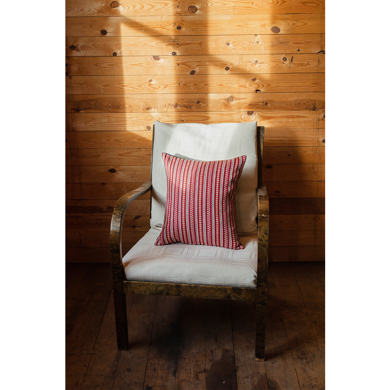 Cushion cover in a traditional design. The Leksand pattern is usually used for the Leksand costume. This fabric is woven in cotton and linen on one side, and black linen on the other. The cushion cover is woven in 40 x 40 cm. It is washable coming with a zipper, and comes with the inner cushion.