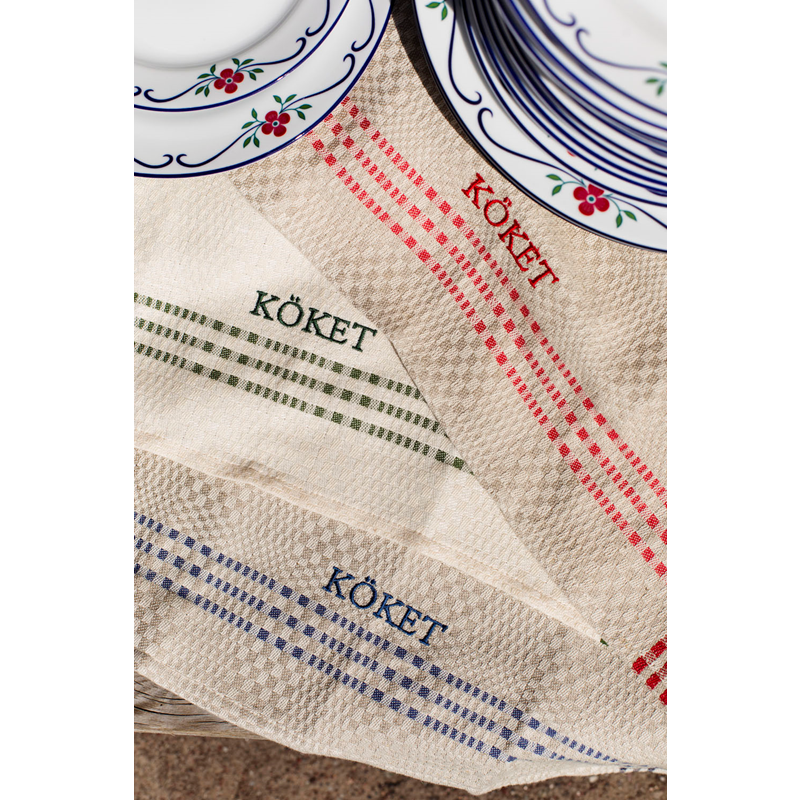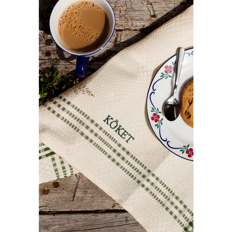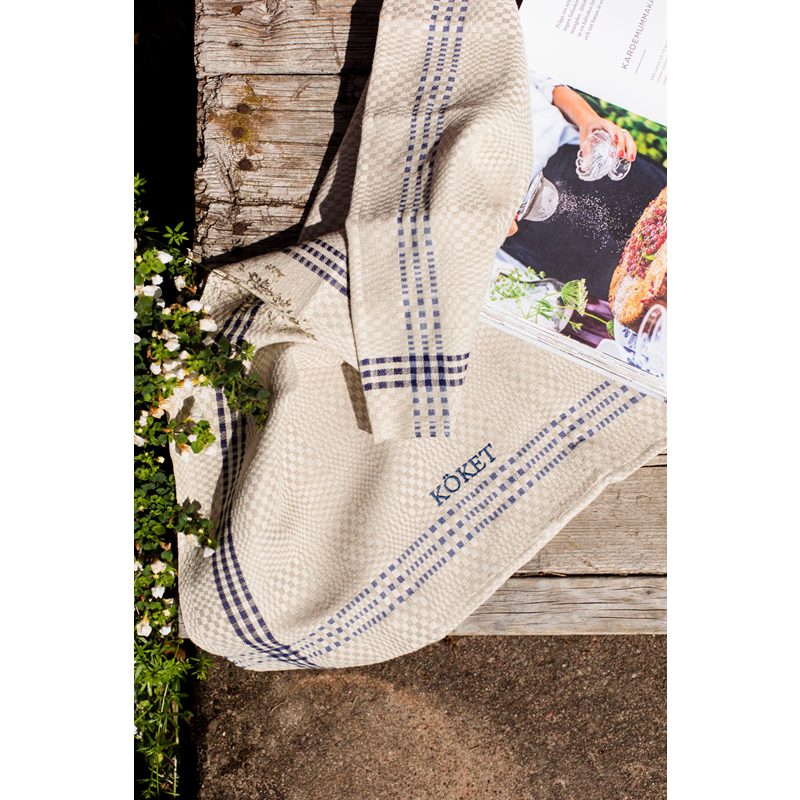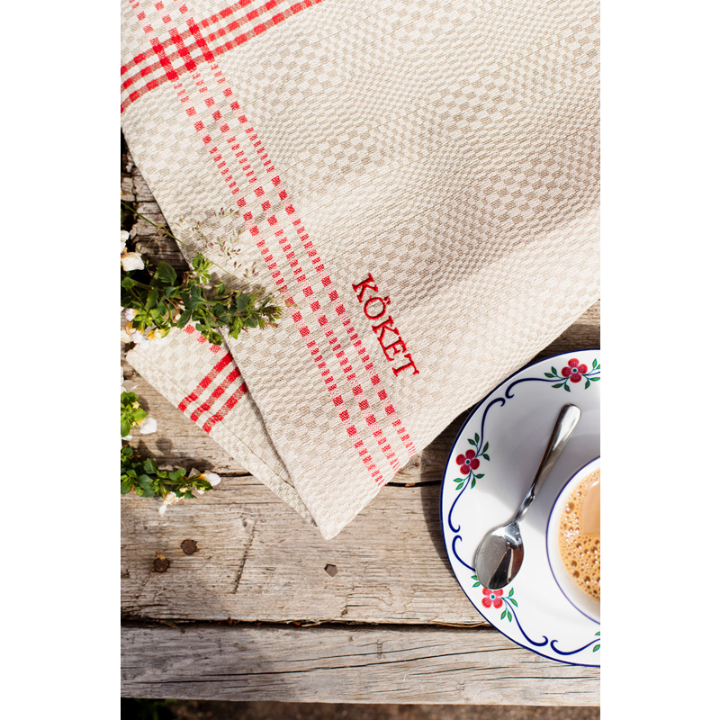 Klassisk kökshandduk av lin och bomull. Handduken är fållad och kommer med hängare. Brodyr med KÖKET i matchande färg. Daladräll är ett tidlöst mönster som passar perfekt för handdukar och bordstabletter. Den klassiska designen med färgad inramning går aldrig ur tiden. På Insjöns Väveri väver vi mönstret på oblekt bomullsvarp med lininslag.För bästa uppsugningsförmåga bör nya handdukar tvättas innan användning då linet är fett efter spinningen.